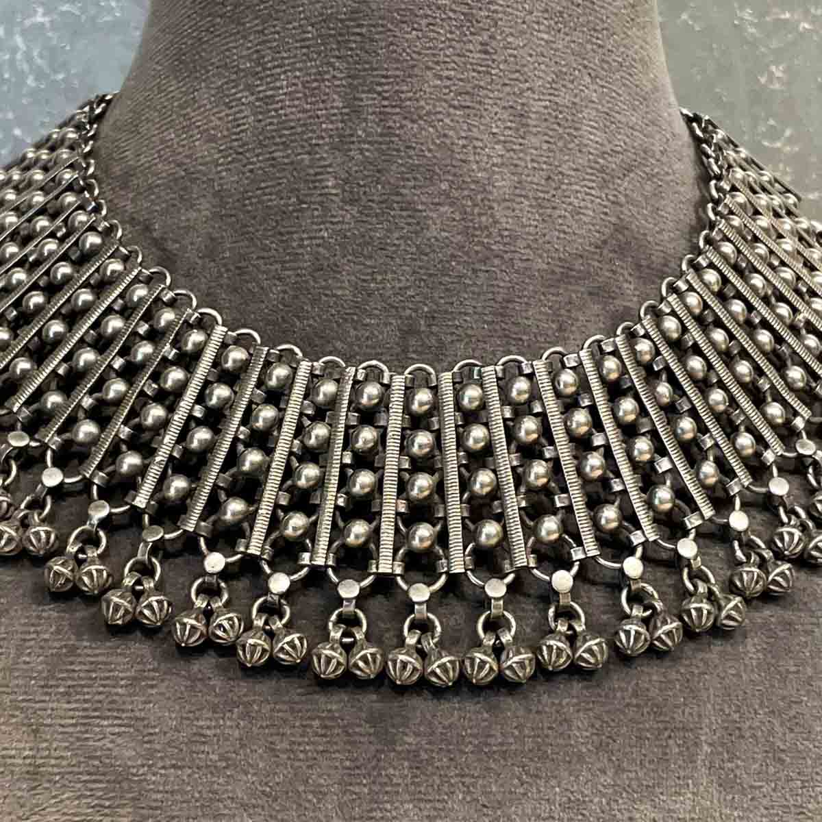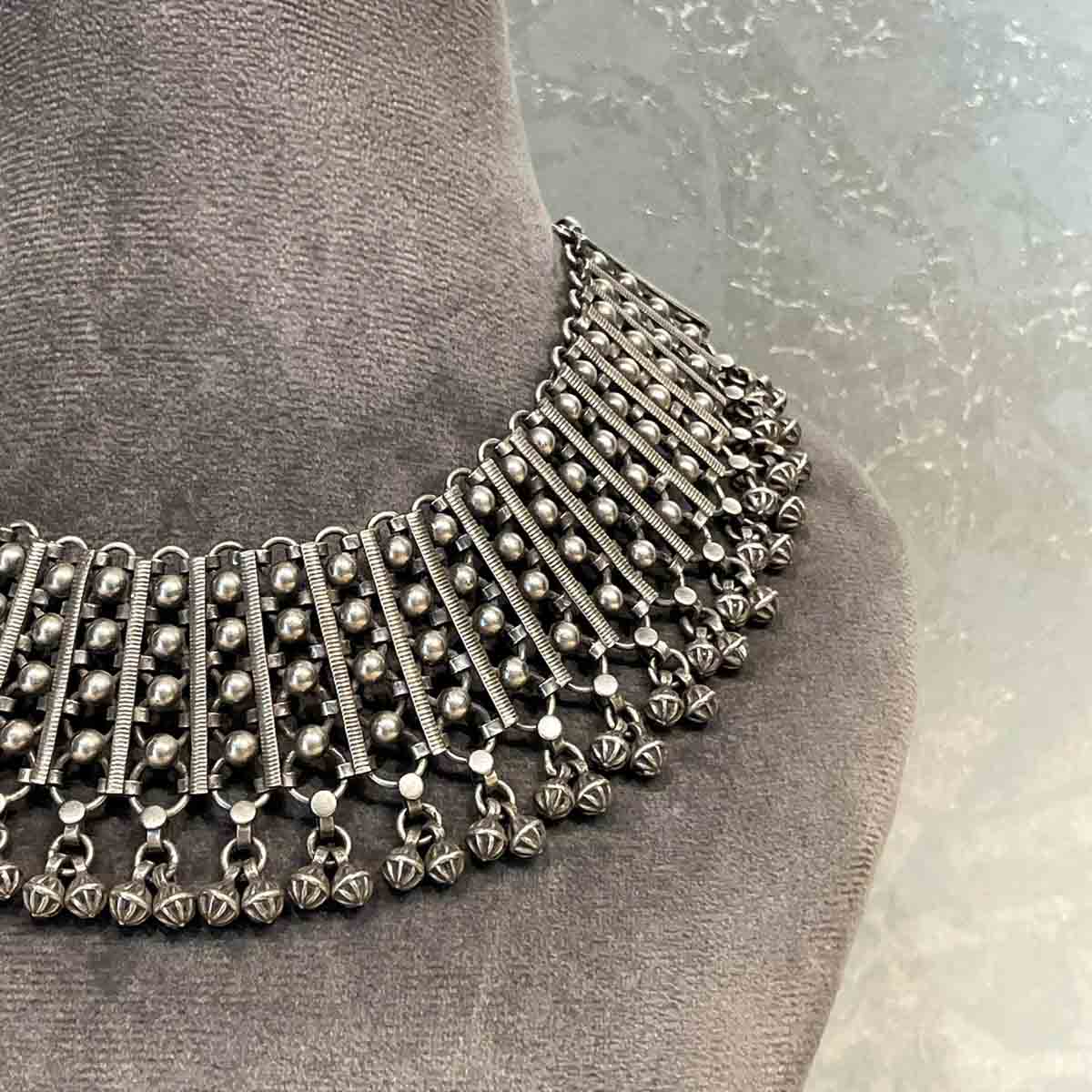 This heavy and chunky piece of pure 92.5 silver is a true craftsmanship. It is aligned with a layer of dangling ghungroos.