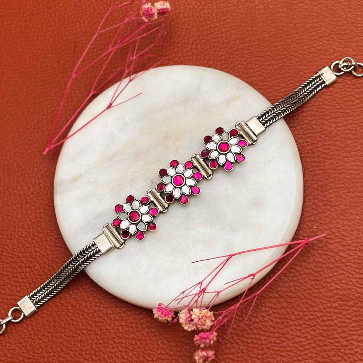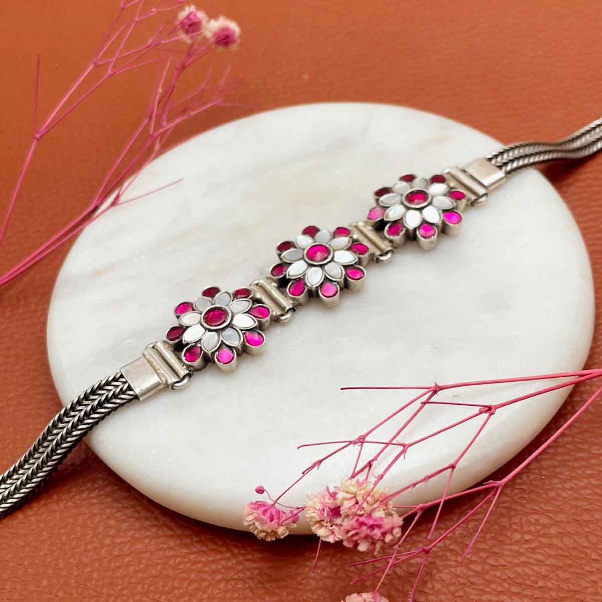 Silver bracelet with floral piece studded with pink and mother of pearl kundan on it.