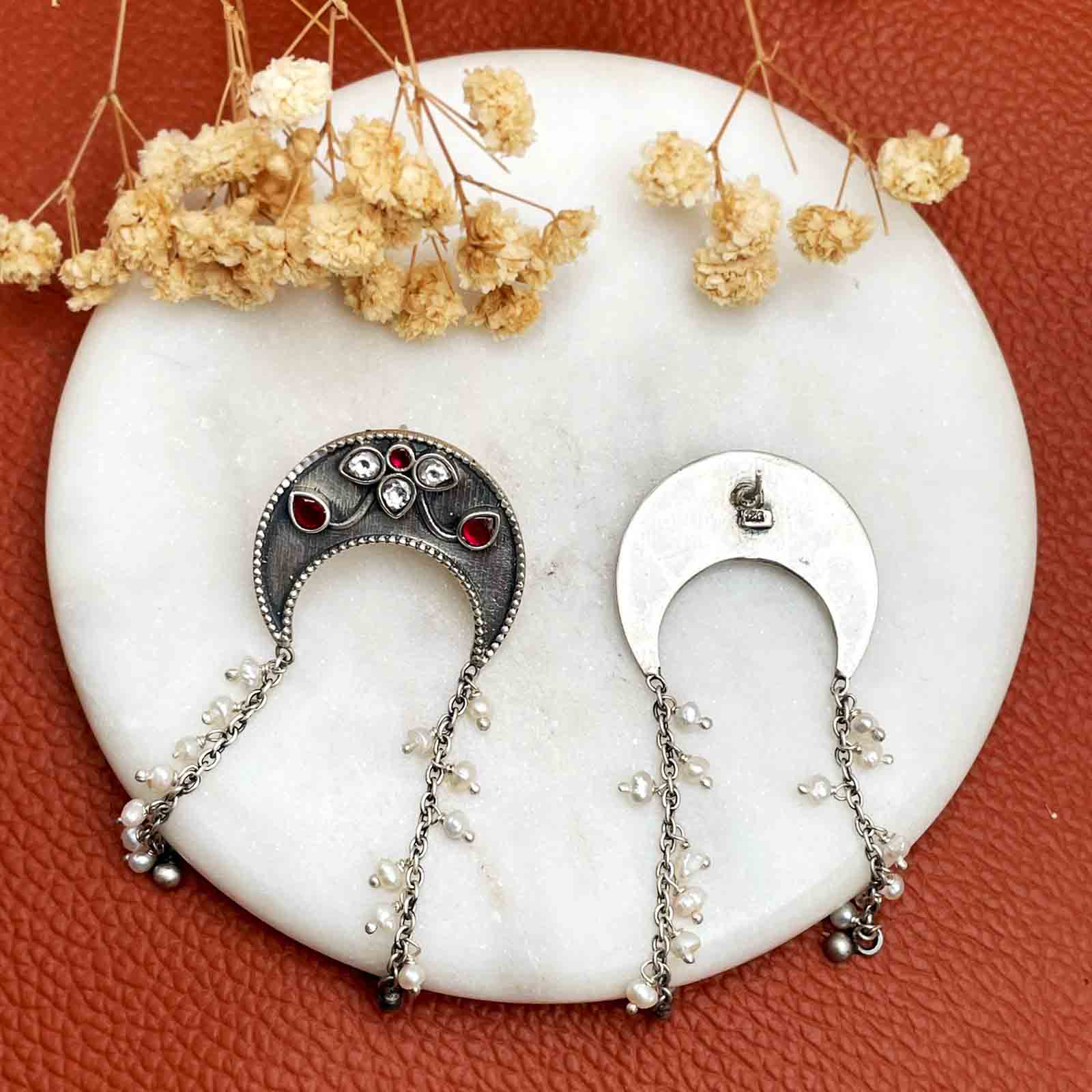 Carved floral stud with pearls in chain and a pink and white kundan set on the chand shape stud.