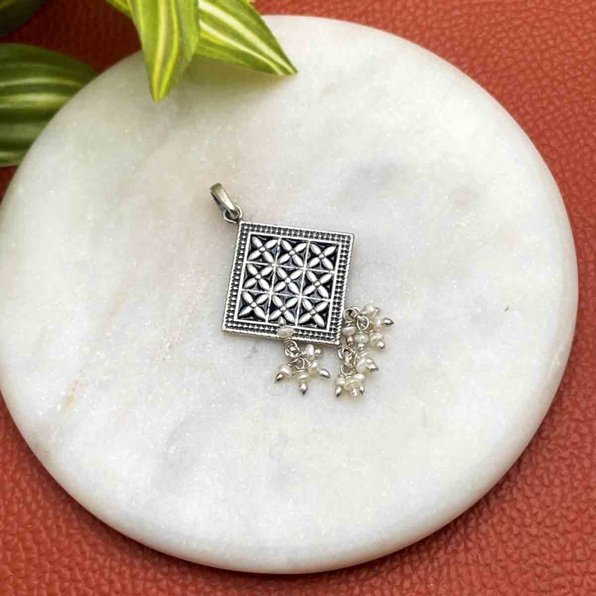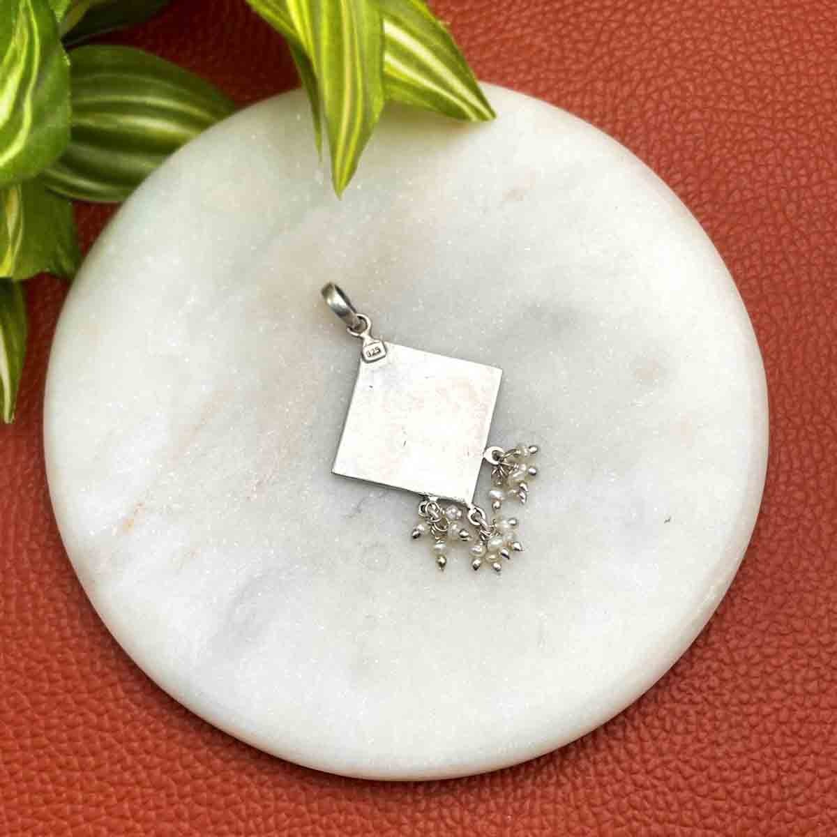 Silver pendant with a lattice design with blue meenakari work on it and bunch of small fresh water pearls hanging.