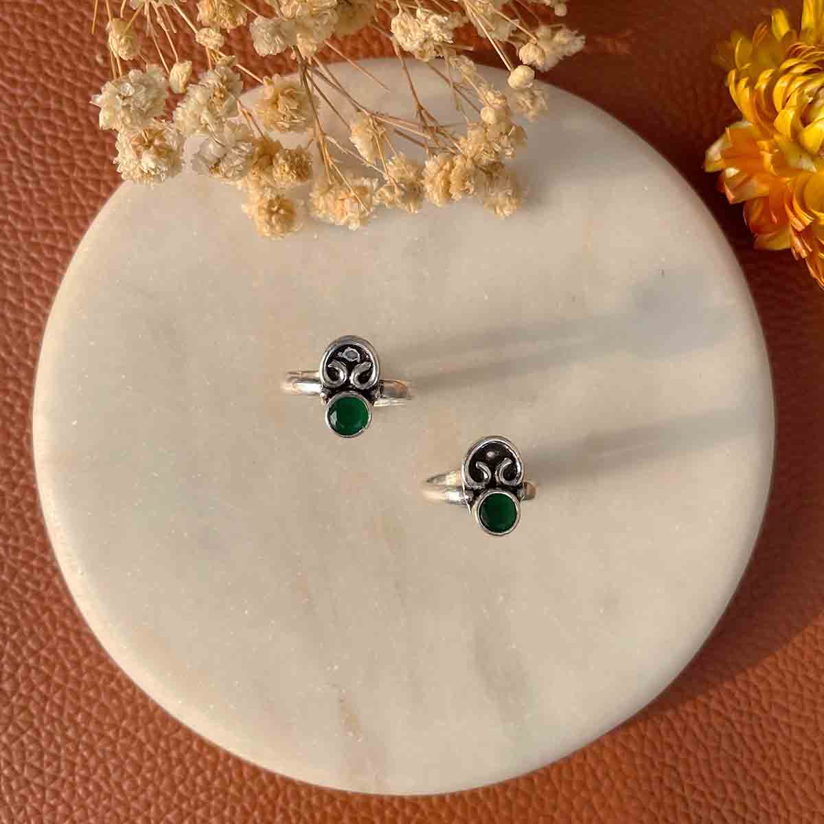 Silver tribal rava work with a green stone set in the toe rings.