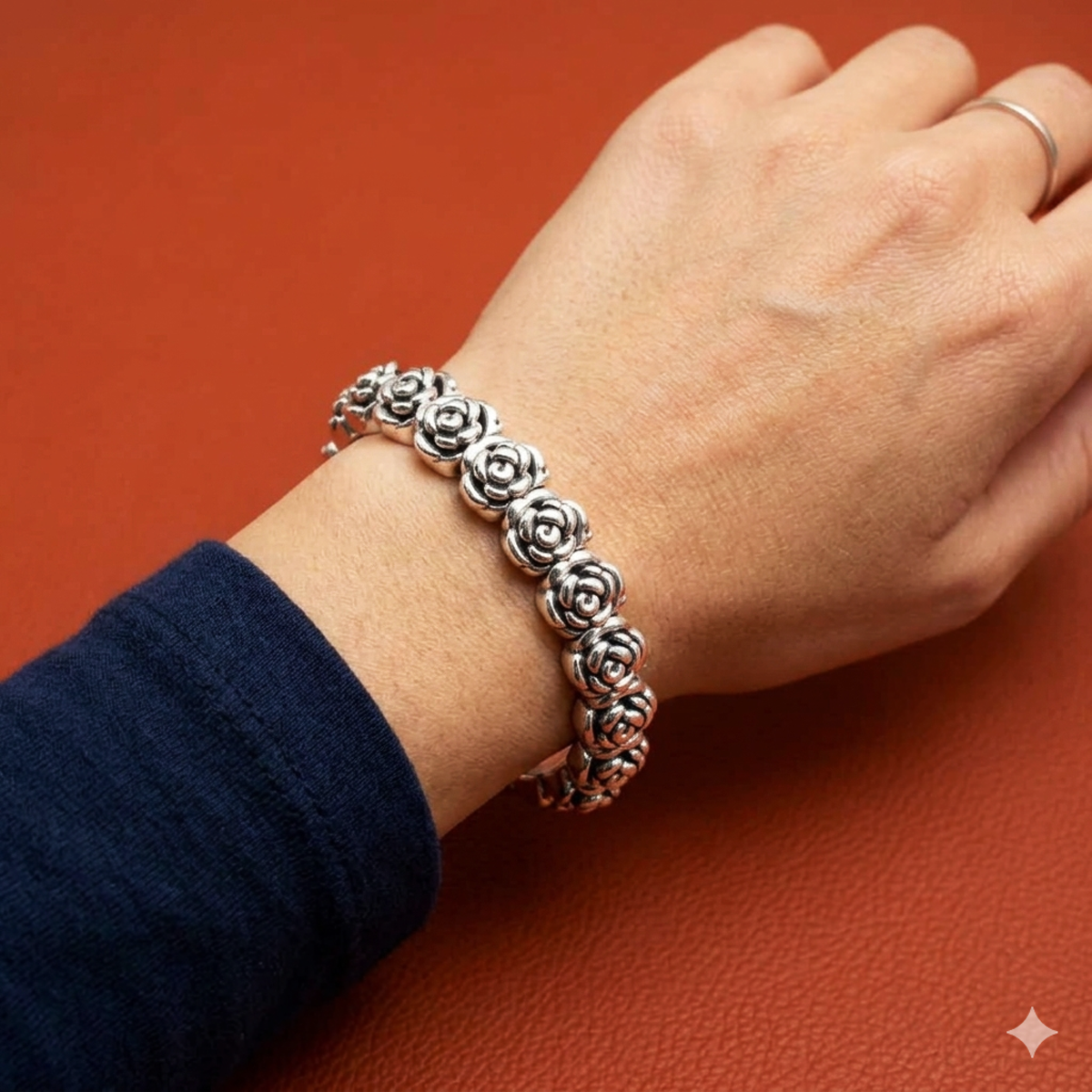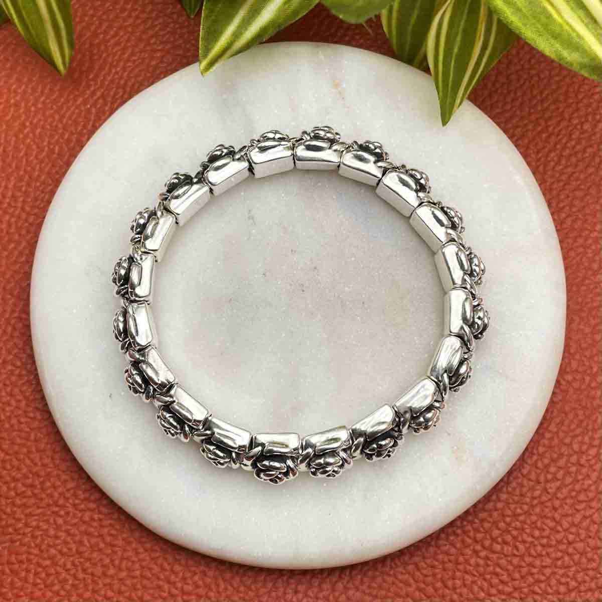 Set in 92.5 silver, this stunning piece features delicate rose motifs joined together to create a flexible, stretchable bracelet.