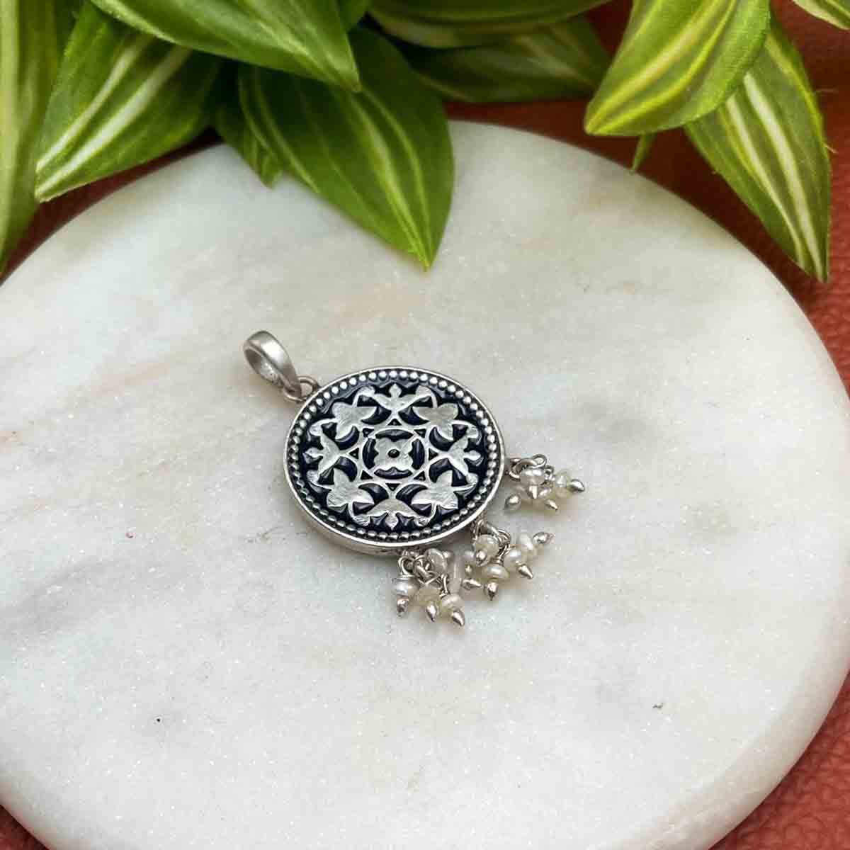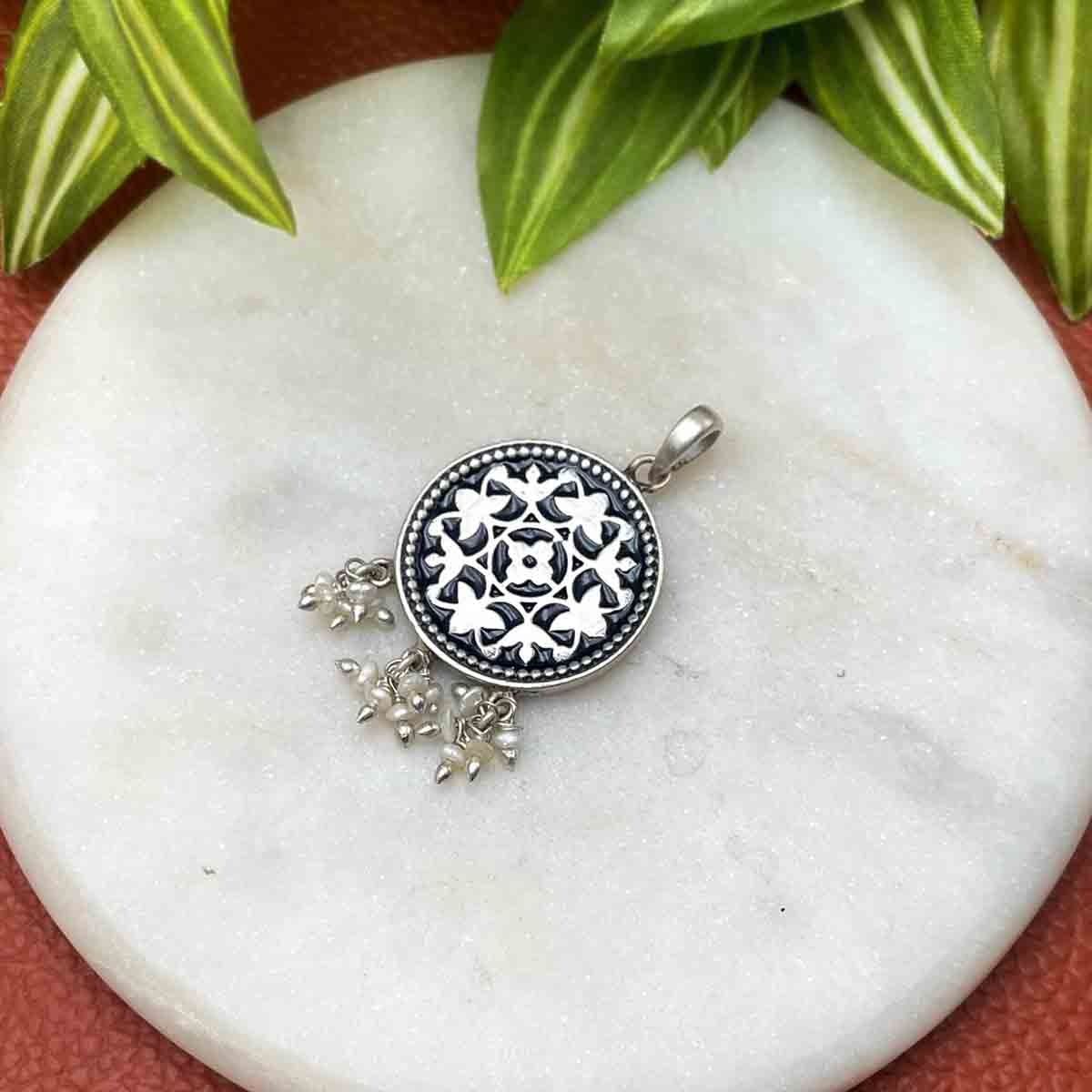 Silver meenakari pendant with floral design pattern and blue meenakari in it.
