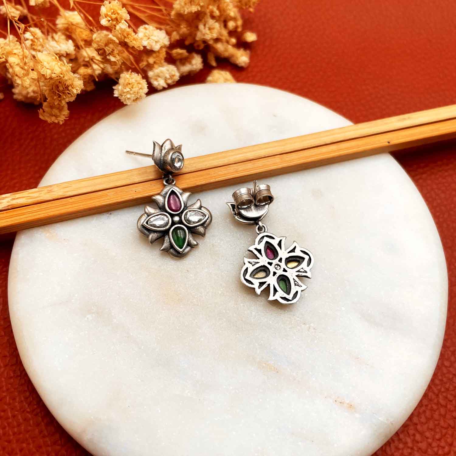 Silver earrings with lotus motif as a stud and a floral motif with stones set in it.