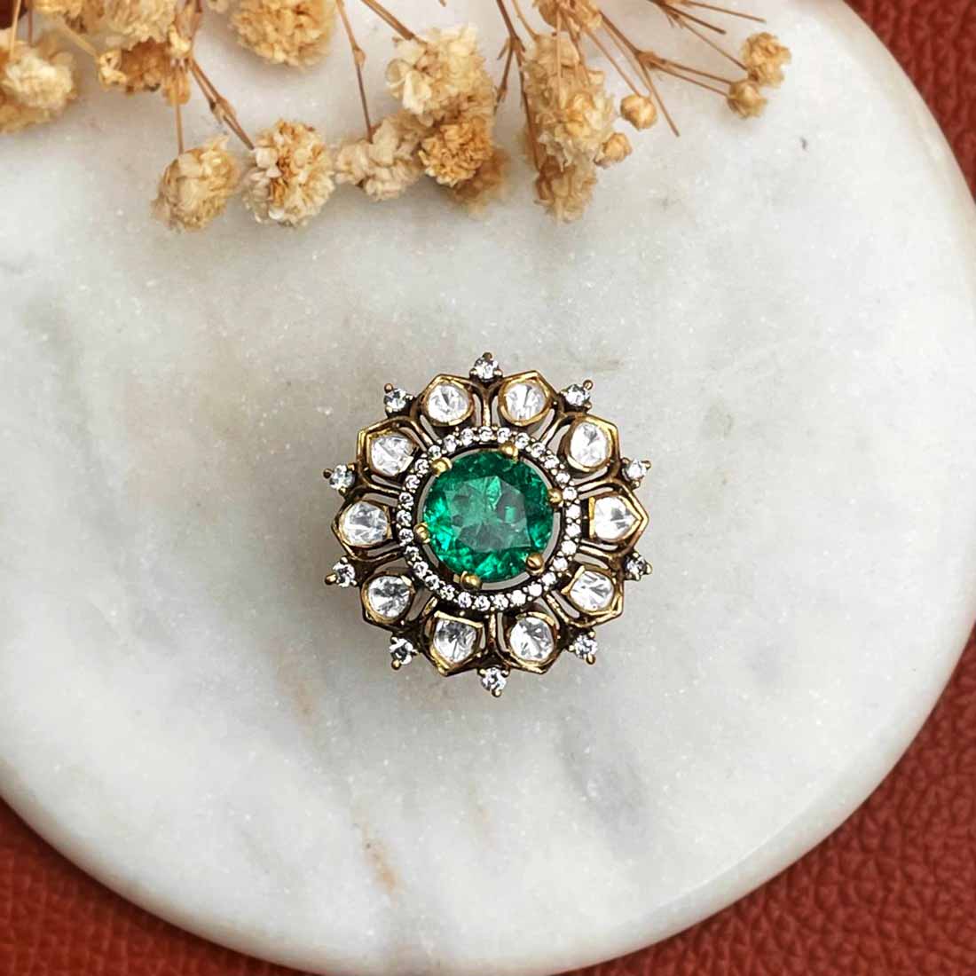 Silver ring with moissanite studded with an emerald green round stone in the center.
