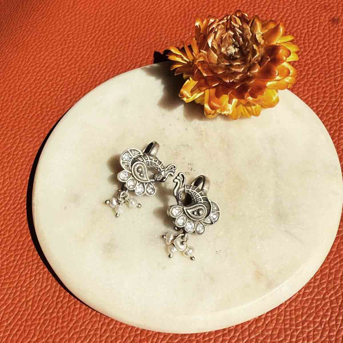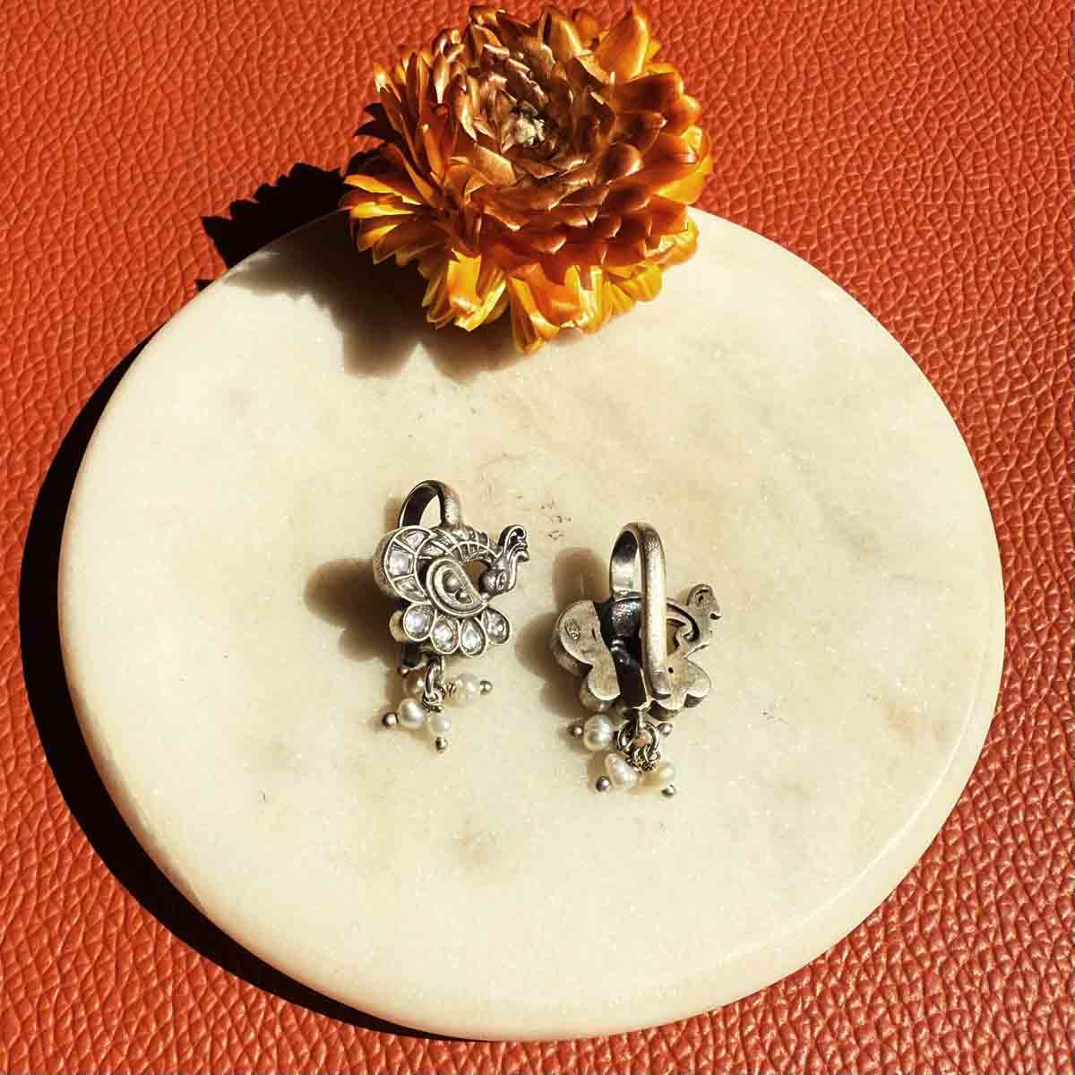 A clip on style bugadi earrings with white kundan studded peacock and pearl drop hanging.