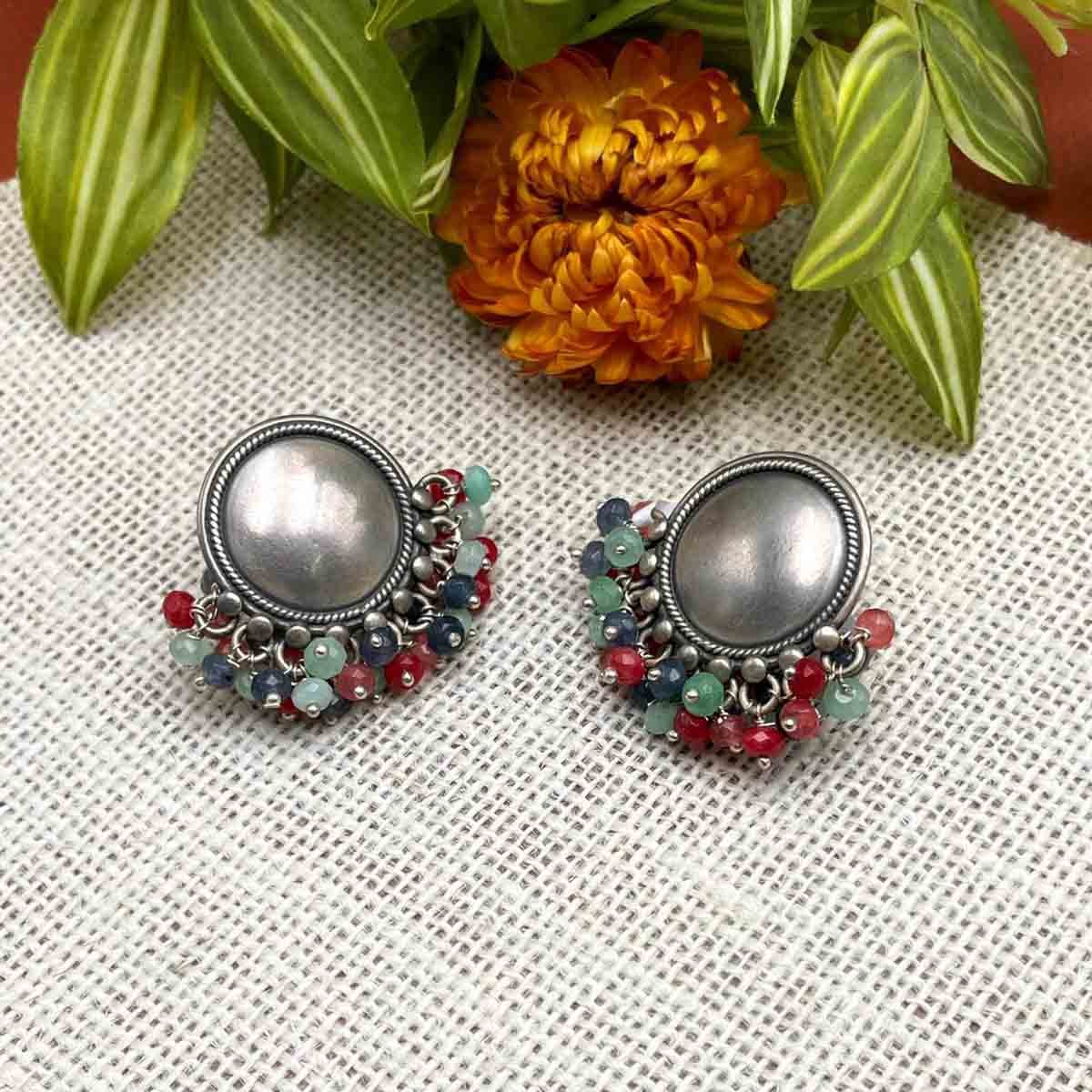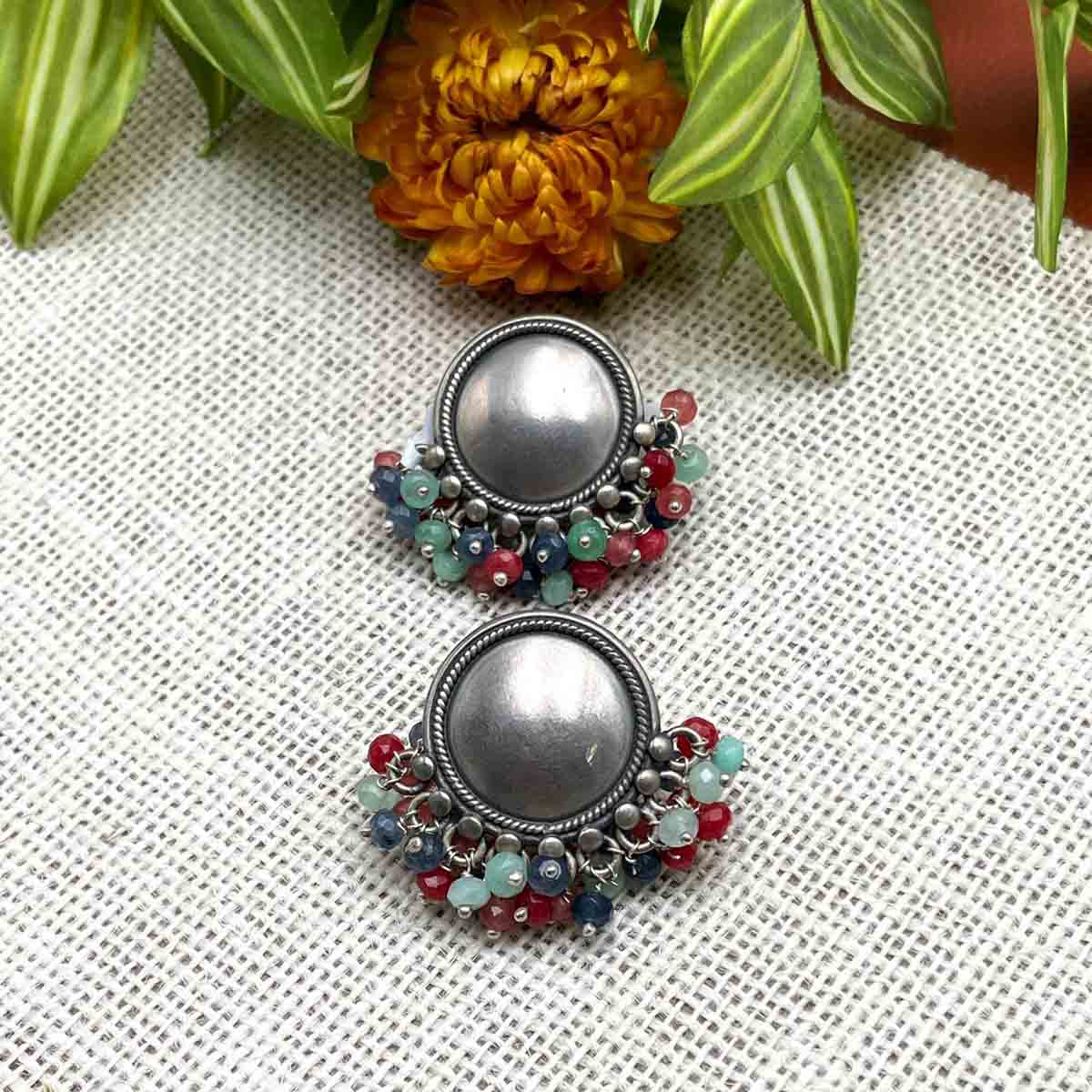 This pair is set with multiple layers of contrasting beads below a round silver thali-style earring head.