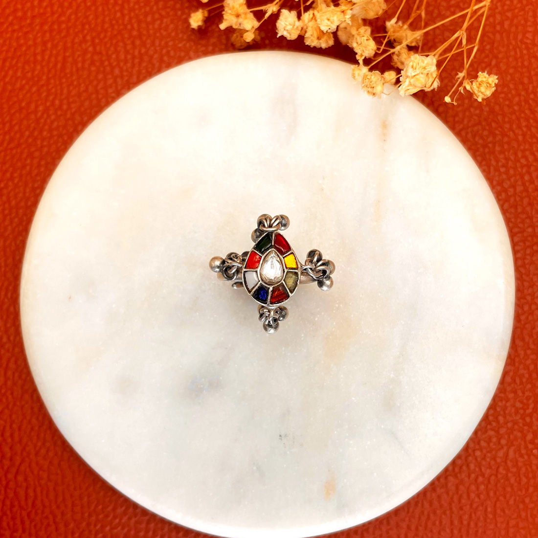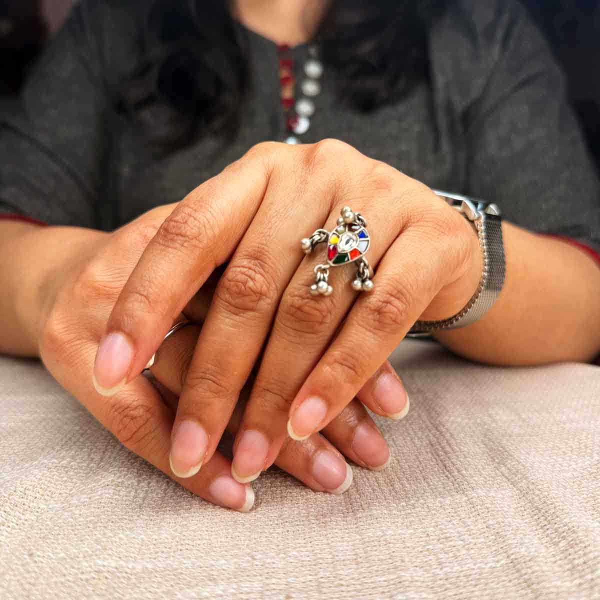 Silver ring with navratna kundan set in a drop shape piece with bunch of ghungroos.