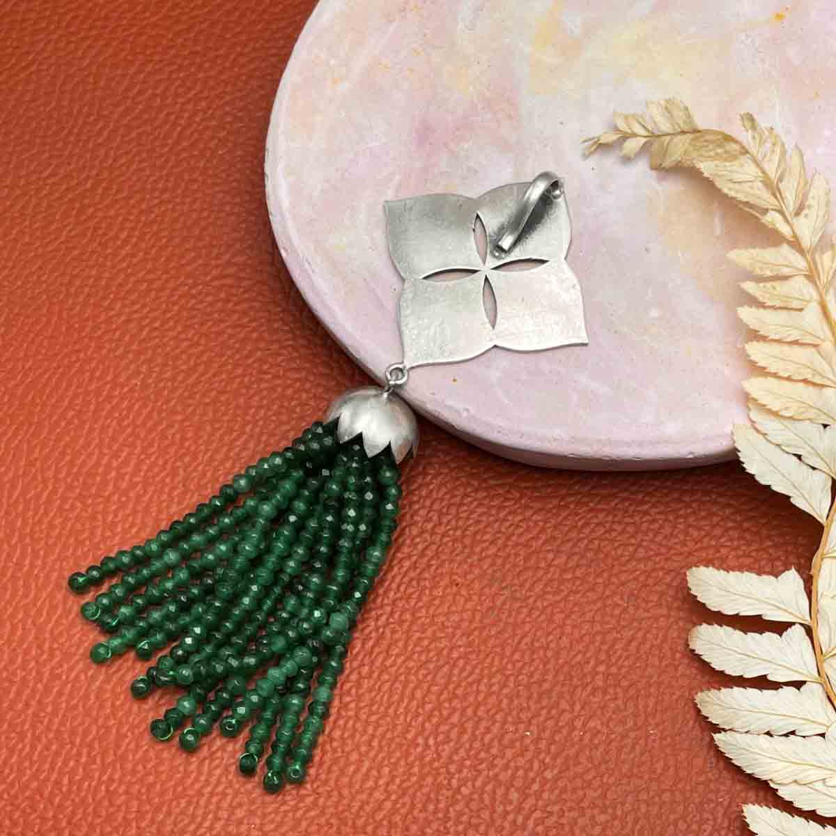 This kite-shaped pendant has a very unique shape. It is set in 92.5 silver. It has numerous layers of green beads dangling below it.