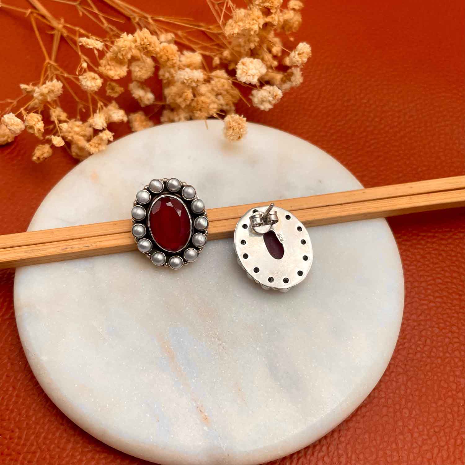 Silver studs with a pink AD stone set in the center and pearls around it giving a vintage look.