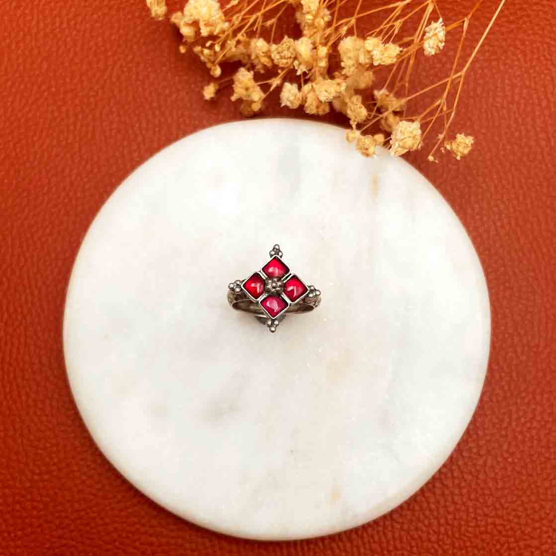 Silver Kundan Ring with pink square shape kundan and adjustable band.