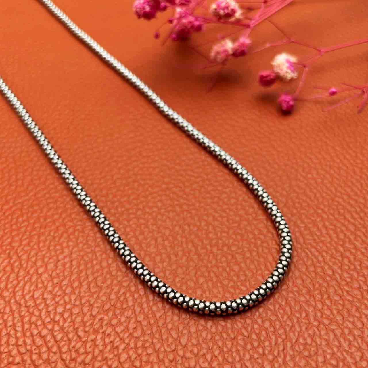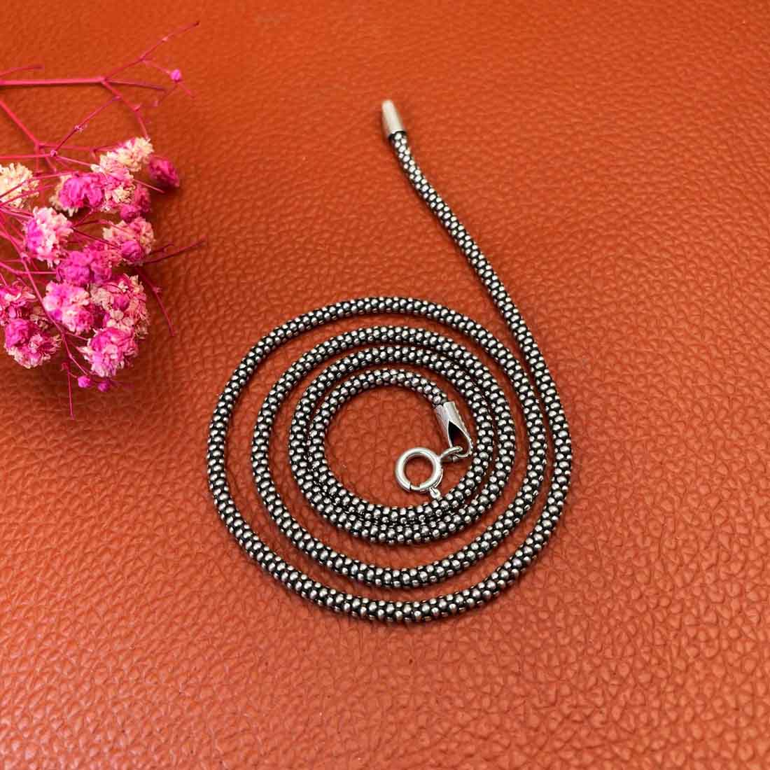 The chain has oxidised finish and is made in pure 92.5 silver .