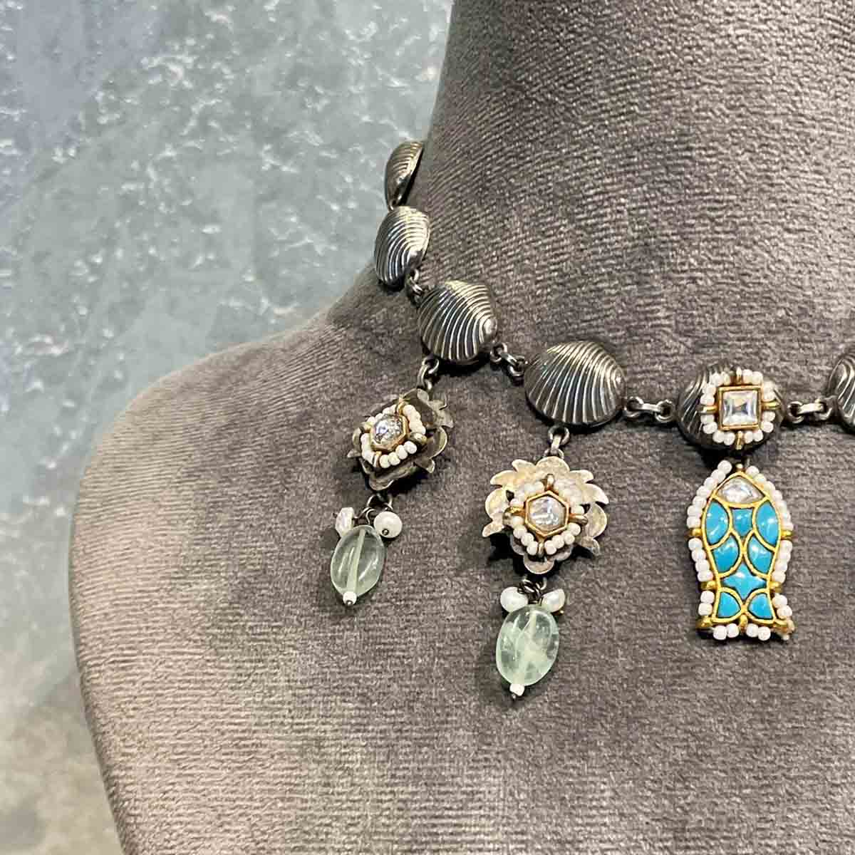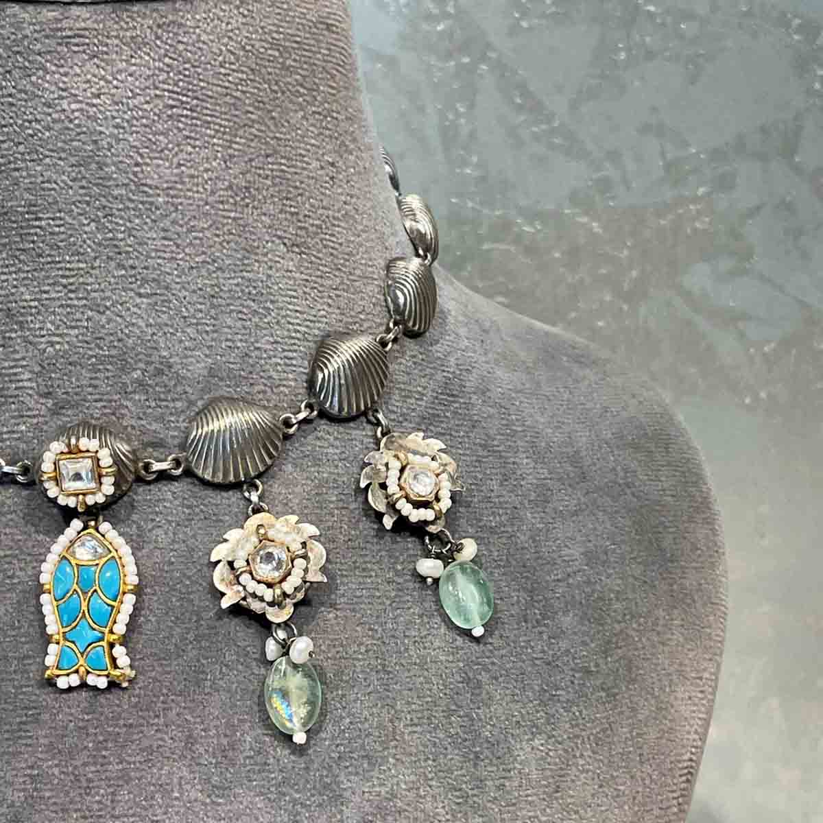 This fusion piece includes stones and pearls and is set in 92.5 silver. It has a dual tone to it.